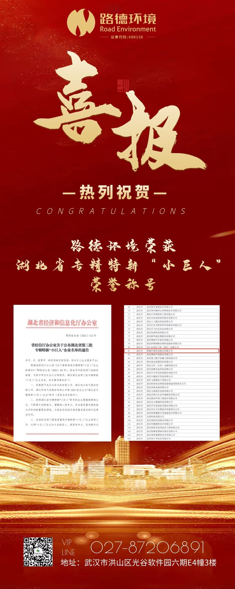 喜報:路德環(huán)境榮獲2021年湖北省專精特新“小巨人”榮譽(yù)稱號