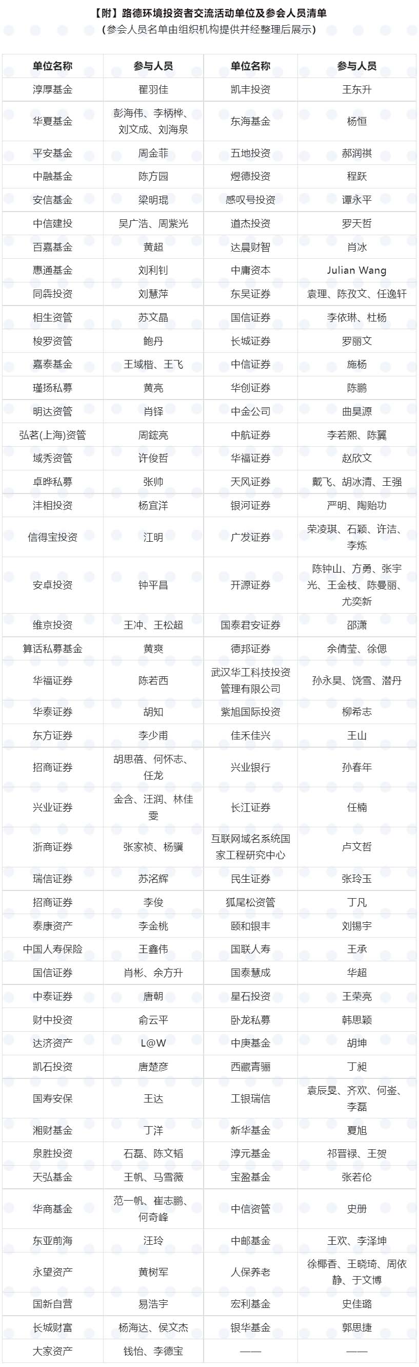 2023年4月28日-5月12日,路德環(huán)境組織了多場(chǎng)線上、線下投資者交流活動(dòng),與中信證券、中信建投證券、銀河證券、浙商證券、東吳證券、中航證券、天風(fēng)證券、建銀理財(cái)、明達(dá)資產(chǎn)、永望資產(chǎn)等90余家機(jī)構(gòu)進(jìn)行了深入溝通。
