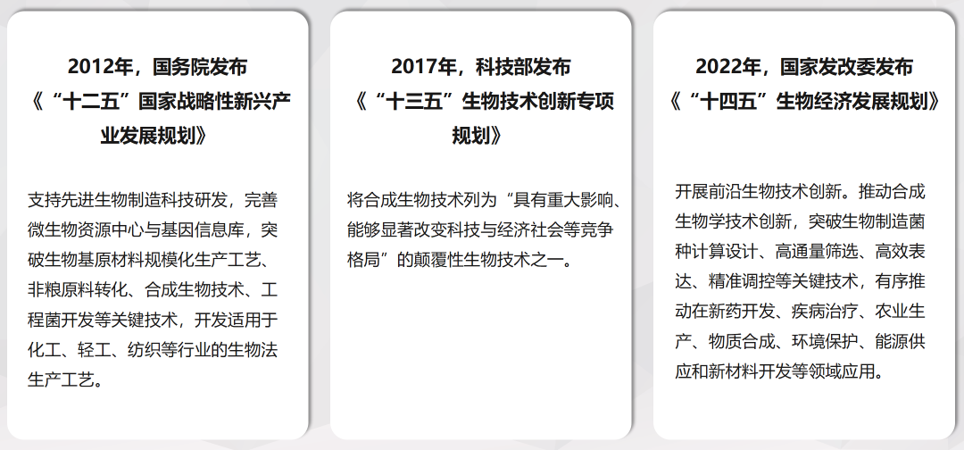 在我國,從“十二五”國家提出支持先進生物制造科技研發(fā),到“十三五”國家將合成生物技術(shù)列為引領(lǐng)產(chǎn)業(yè)變革的顛覆性技術(shù)之一,再到“十四五”明確表示“要有序推動合成生物技術(shù)在新藥開發(fā)、疾病治療、農(nóng)業(yè)生產(chǎn)、物質(zhì)合成、環(huán)境保護、能源供應(yīng)和新材料開發(fā)等領(lǐng)域應(yīng)用”,一直以來,隨著國家持續(xù)出臺政策予以大力支持,我國合成生物產(chǎn)業(yè)擁有廣闊的發(fā)展前景。