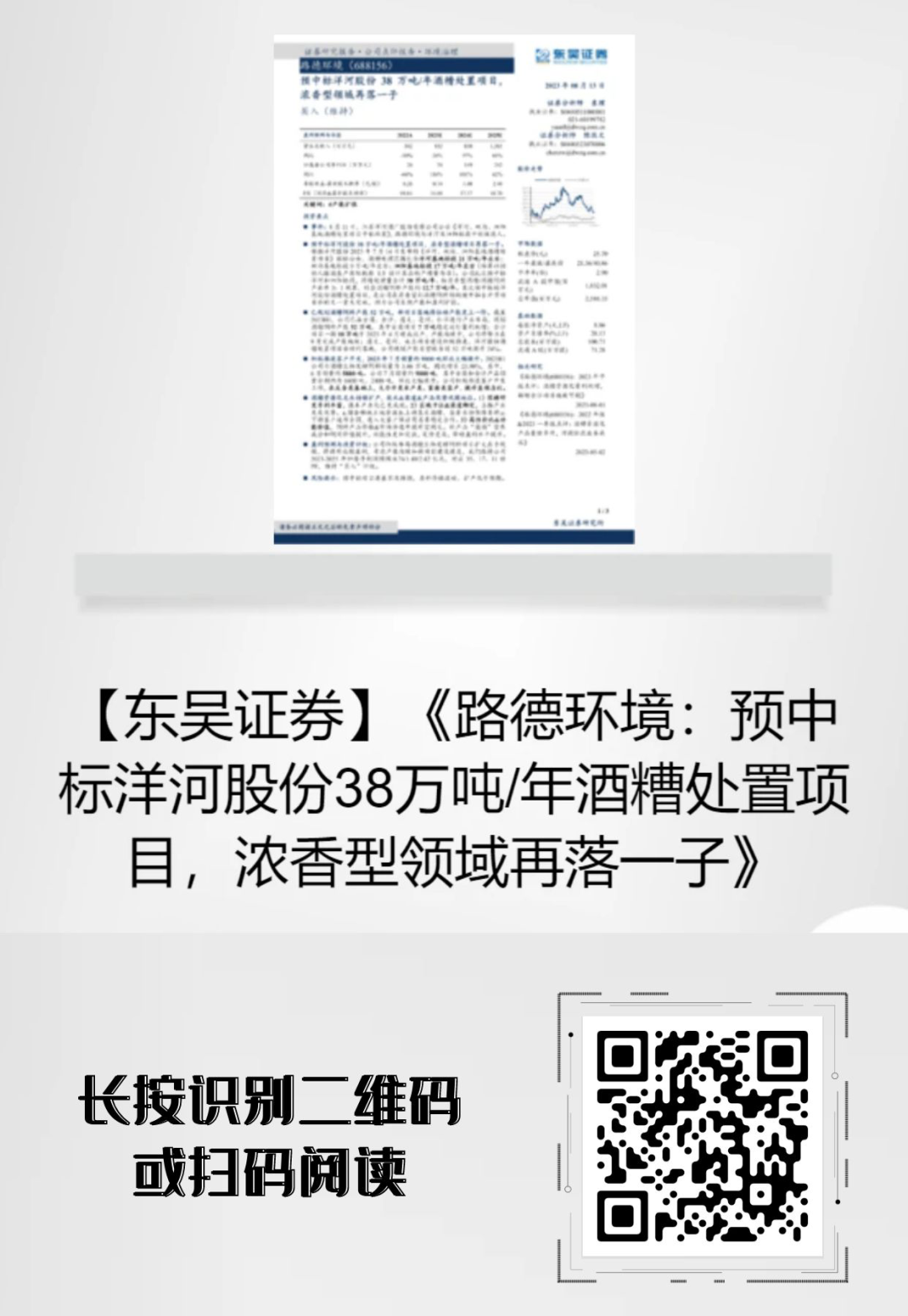 2023年8月11日,江蘇洋河酒廠股份有限公司公示《洋河、雙溝、泗陽基地酒糟處置項(xiàng)目中標(biāo)結(jié)果》,路德環(huán)境為洋河及泗陽標(biāo)段中標(biāo)候選人。東吳證券發(fā)布點(diǎn)評報(bào)告,對此事件進(jìn)行深入分析,并對公司業(yè)務(wù)現(xiàn)狀和未來發(fā)展前景給予肯定。