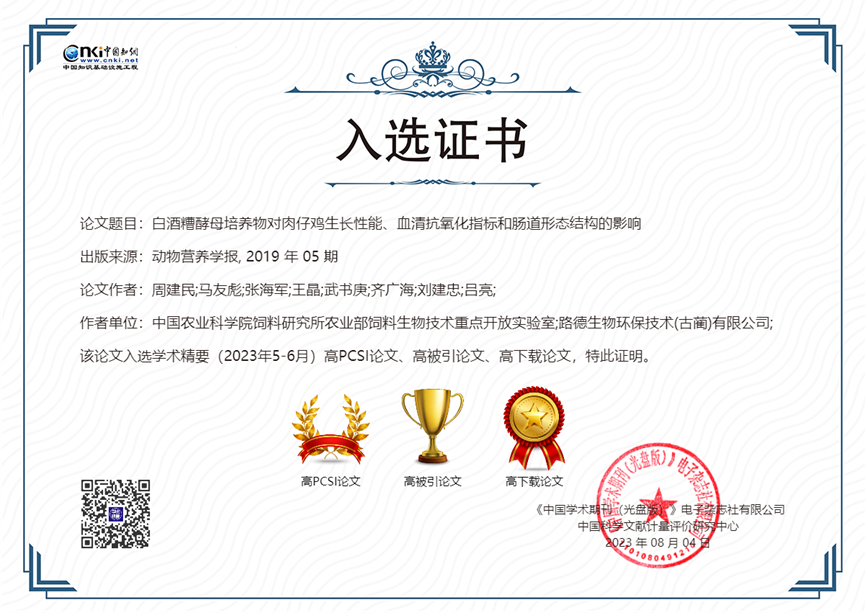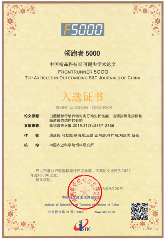 公司與中國農(nóng)業(yè)科學(xué)院飼料研究所家禽營養(yǎng)與飼料創(chuàng)新團(tuán)隊(duì)共同完成并發(fā)表于《動(dòng)物營養(yǎng)學(xué)報(bào)》(2019,31(5): 2357-2366)的學(xué)術(shù)論文—《白酒糟酵母培養(yǎng)物對肉仔雞生長性能、血清抗氧化指標(biāo)和腸道形態(tài)結(jié)構(gòu)的影響》,入選2022年度“領(lǐng)跑者5000—中國精品科技期刊頂尖學(xué)術(shù)論文(F5000)”和學(xué)術(shù)精要(2023年5-6月)高PCSI論文、高被引論文和高下載論文。