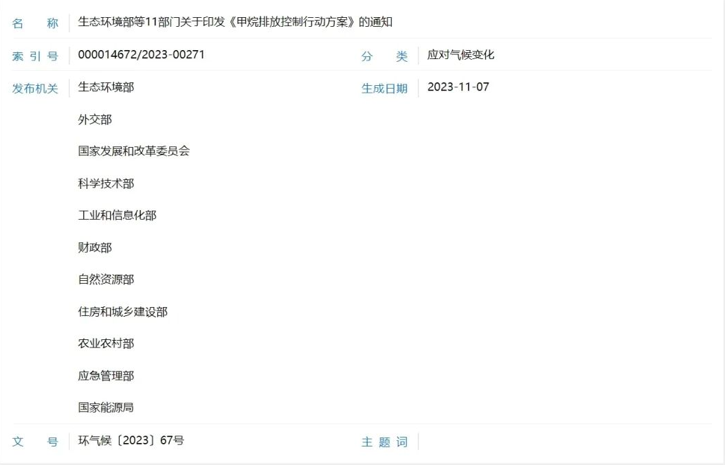 11月7日,生態(tài)環(huán)境部等11部門(mén)聯(lián)合印發(fā)《甲烷排放控制行動(dòng)方案》的通知,這是我國(guó)開(kāi)展甲烷排放管理控制的頂層設(shè)計(jì)文件,明確提出了“十四五”和“十五五”期間甲烷排放控制目標(biāo)。