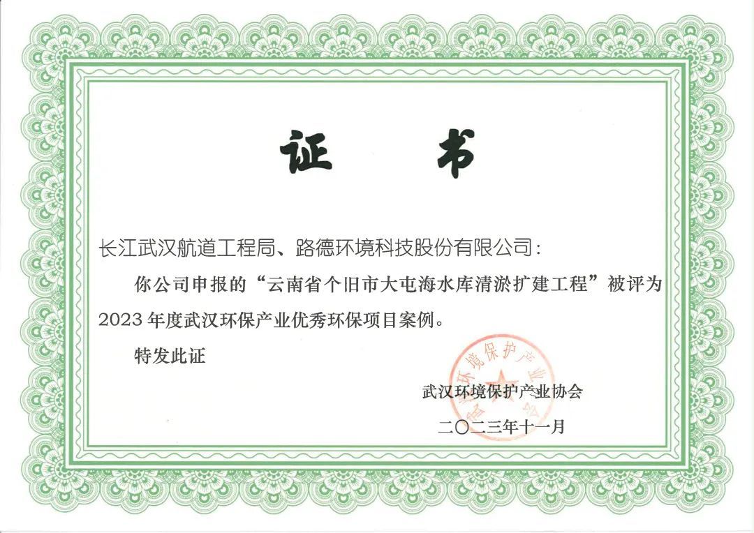 公司“云南省個(gè)舊市大屯海水庫清淤擴(kuò)建工程”被武漢環(huán)境保護(hù)產(chǎn)業(yè)協(xié)會(huì)評(píng)選為“2023年度武漢環(huán)保產(chǎn)業(yè)優(yōu)秀環(huán)保項(xiàng)目案例”。