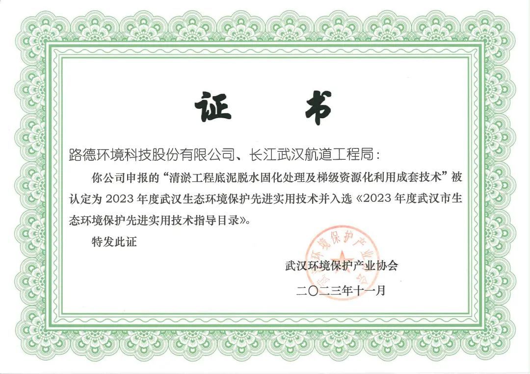 公司“清淤工程底泥脫水固化處理及梯級(jí)資源化利用成套技術(shù)”被武漢環(huán)境保護(hù)產(chǎn)業(yè)協(xié)會(huì)認(rèn)定為“2023年度武漢生態(tài)環(huán)境保護(hù)先進(jìn)實(shí)用技術(shù)”并入選《2023年度武漢市生態(tài)環(huán)境保護(hù)先進(jìn)實(shí)用技術(shù)指導(dǎo)目錄》。