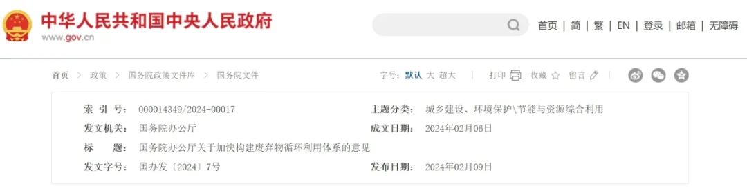 春節(jié)前夕,國務(wù)院辦公廳發(fā)布《關(guān)于加快構(gòu)建廢棄物循環(huán)利用體系的意見(點擊閱讀政策原文)》(國辦發(fā)〔2024〕7號,以下簡稱《意見》)。